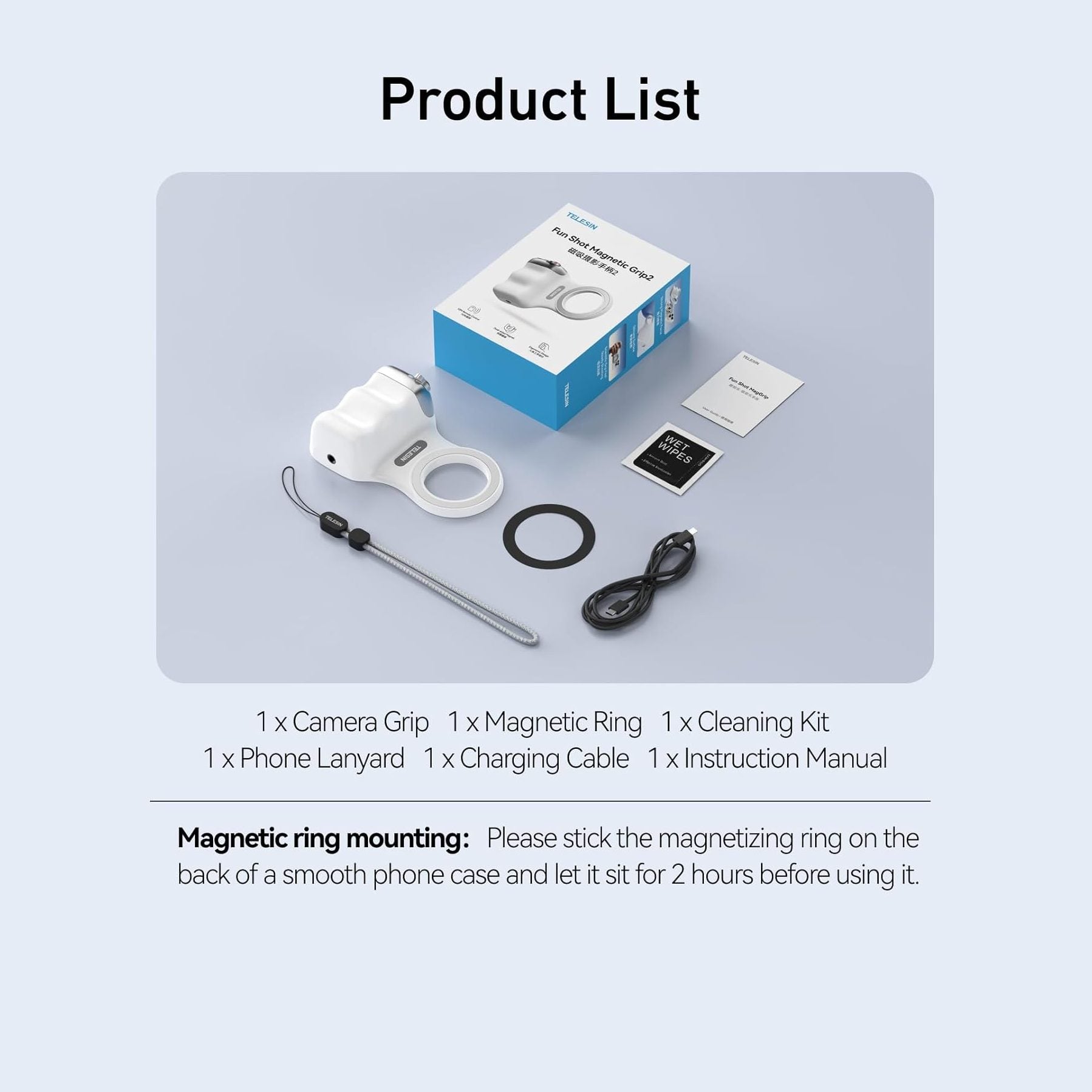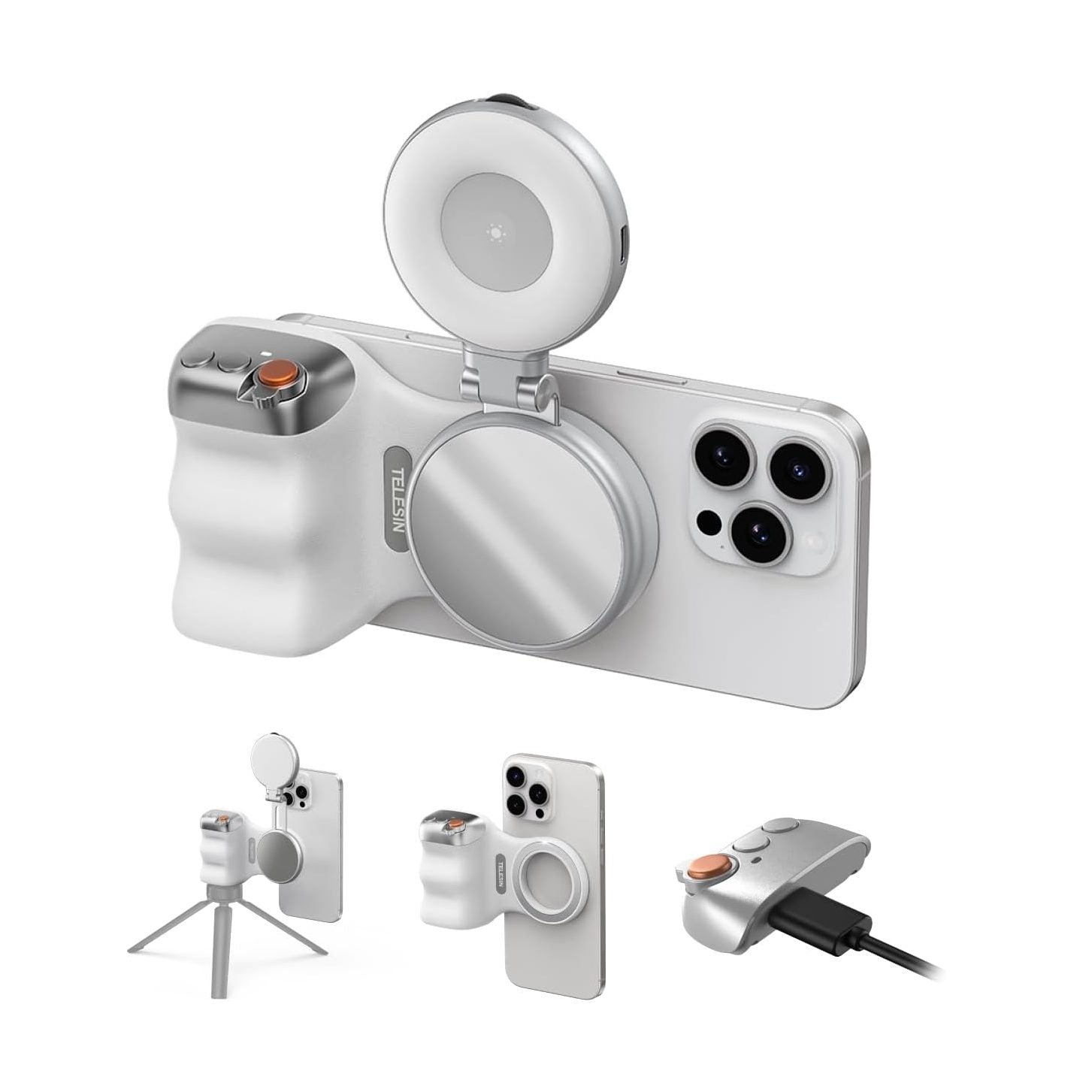 Complete Creator Kit: The TELESIN Creator Kit helps you unleash your creativity and is ideal for content creators. This 2-in-1 kit includes: Fun shot grip - Phone camera grip with wireless shutter button; Magnetic selfie light - LED selfie ring light with 360° rotatable adjustment and built-in Mirror.