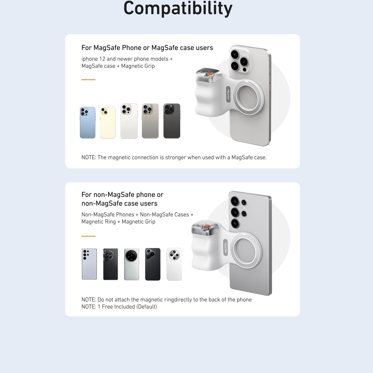 Easy Magnetic Mount: The magnetic mount quickly and securely attaches all components to any smartphone. It works with MagSafe or MagSafe-compatible cases. The included magnetic ring also works with Android phones